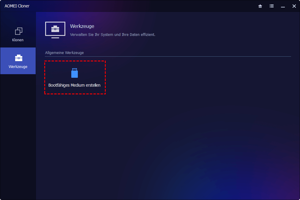 Wenn Ihr Computer nicht startet und Sie wichtige Dateien von Ihrem Computer kopieren oder eine Klon-Operation durchführen müssen, benötigen Sie ein bootfähiges Medium, um den Computer in die PE-Umgebung zu starten. AOMEI Cloner hilft Ihnen, mit diesem Tool schnell und einfach ein kompatibles bootfähiges WinPE-Medium erstellen.
