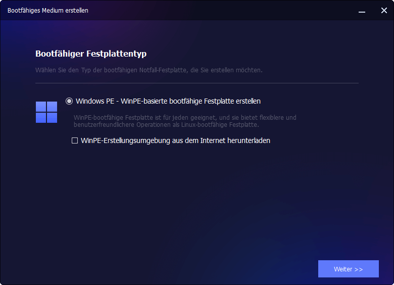2. Es kann ein auf Windows PE basierendes bootfähiges Medium erstellt werden. Die Option „WinPE-Erstellungsumgebung aus dem Internet herunterladen“ wird angezeigt. Klicken Sie auf „Weiter“, um den Erstellungsprozess für das bootfähige Medium zu starten.