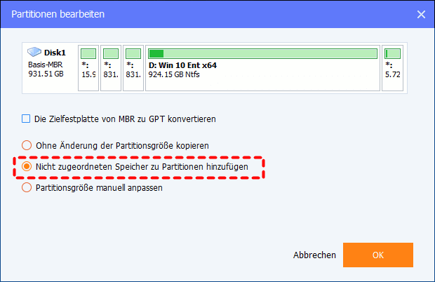 • Nicht zugeordneten Speicher zu Partitionen hinzufügen: Die Partitionen der Zielfestplatte werden automatisch an die Größe der gesamten Festplatte angepasst, entsprechend der Festplattengröße.