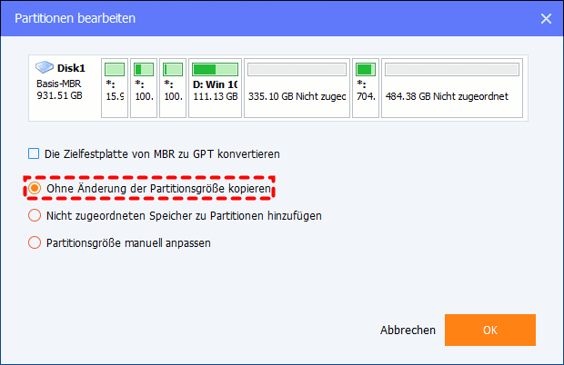 • Ohne Änderung der Partitionsgröße kopieren: Nehmen Sie keine Änderungen an den Partitionsgrößen vor. Wenn Sie die Festplatte auf eine größere Festplatte klonen möchten, wählen Sie stattdessen die letzten beiden Optionen.