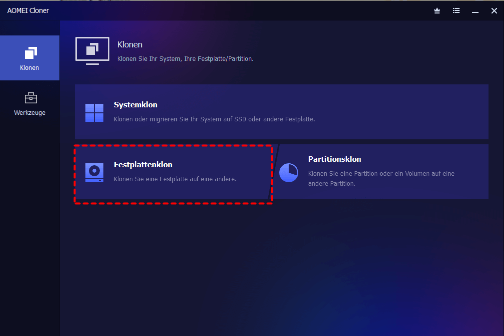 Starten Sie AOMEI Cloner. Wählen Sie im Menü auf der linken Seite „Klonen“ und dann „Festplattenklon“.