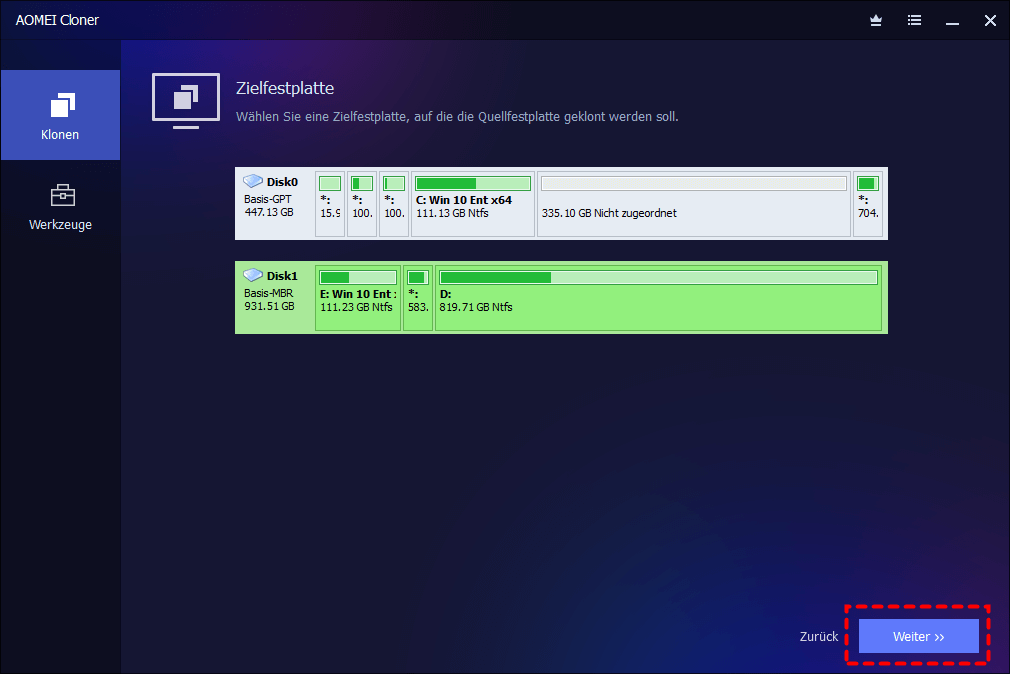Wählen Sie die Zielfestplatte aus, auf die die Quellfestplatte geklont werden soll, und klicken Sie auf „Weiter“.
