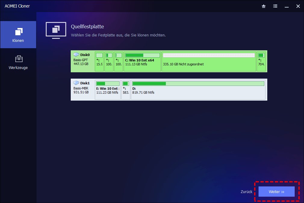 Wählen Sie die Quellfestplatte aus, die Sie klonen möchten, und klicken Sie auf „Weiter“.