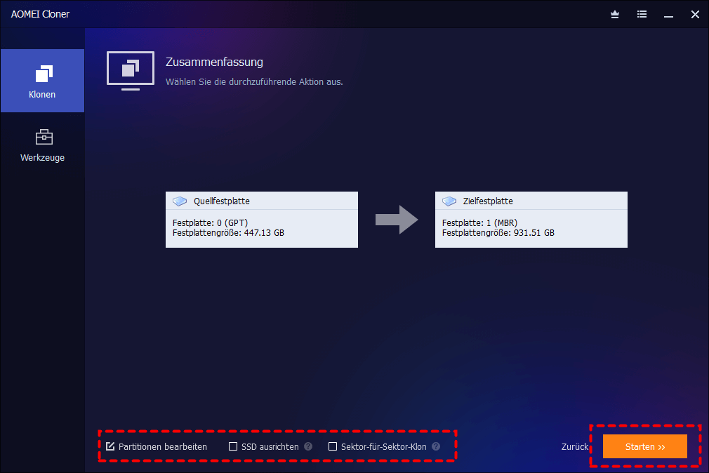 Zeigen Sie eine Vorschau der Informationen Ihrer Quell- und Zielfestplatte an. Legen Sie in der unteren linken Ecke die gewünschten erweiterten Einstellungen wie folgt fest.