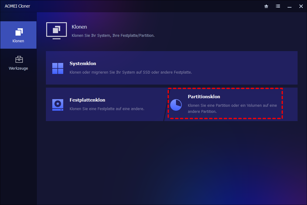 Starten Sie AOMEI Cloner. Wählen Sie im linken Reiter die Option „Klonen“ und dann „Partitionsklon“.