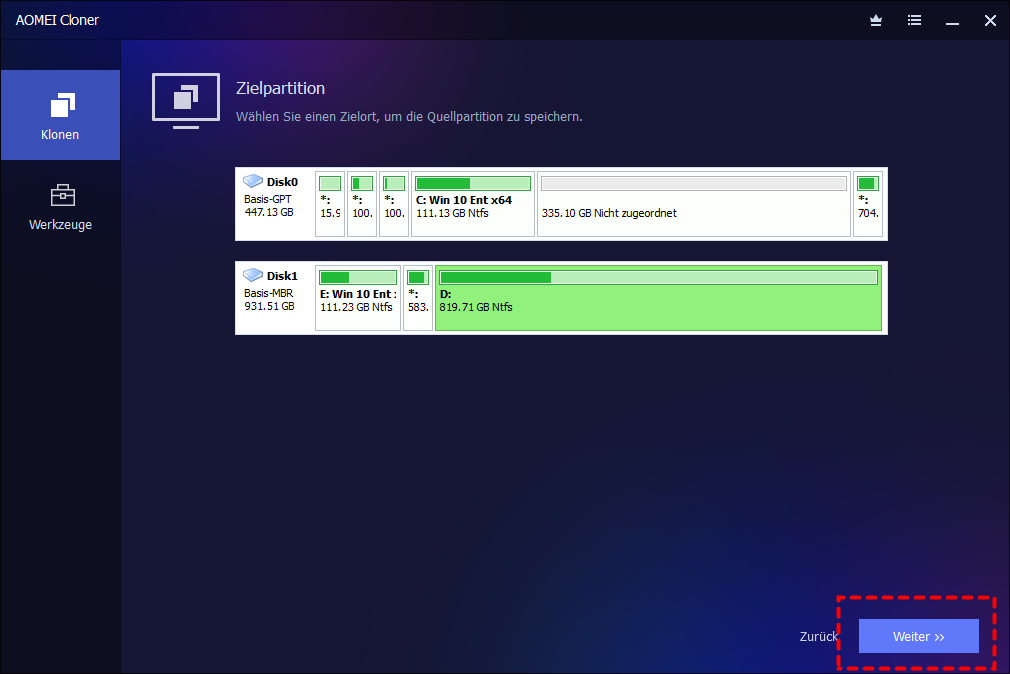 Wählen Sie einen geeigneten nicht zugewiesenen Speicherplatz oder eine vorhandene Partition auf der gewünschten Festplatte als Zielpartition aus und klicken Sie auf „Weiter“.