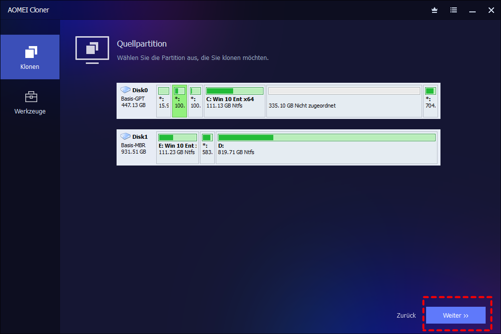 Wählen Sie die Quellpartition bzw. das Volume aus, das Sie klonen möchten, und klicken Sie auf „Weiter“.