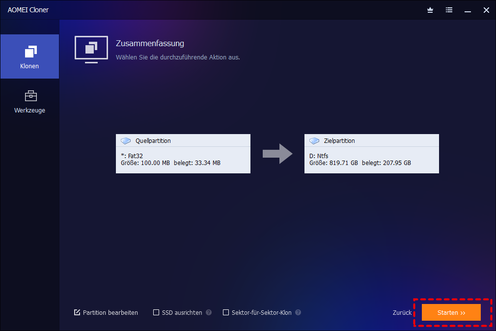 Schritt 4: Klonvorschau und Partition bearbeiten (optional)