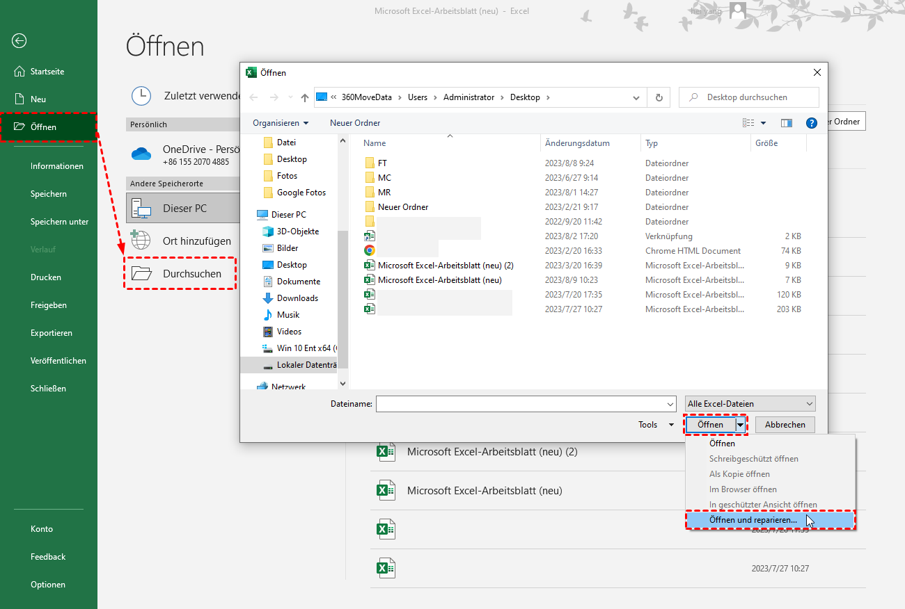 Weg 2: Excel-Funktion „Öffnen und Reparieren“ verwenden