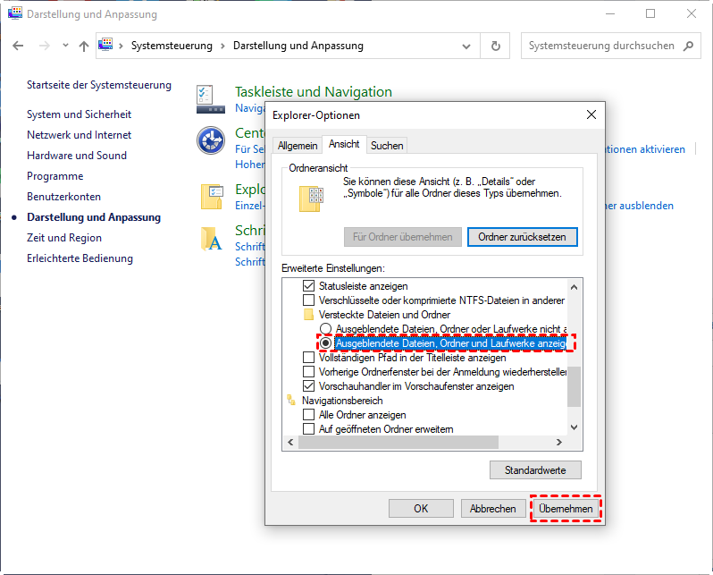 Schritt 3: In dem Popup-Fenster wechseln Sie zum Bereich „Ansicht“ und aktivieren Sie die Option „Ausgeblendete Dateien, Ordner und Laufwerke anzeigen“.