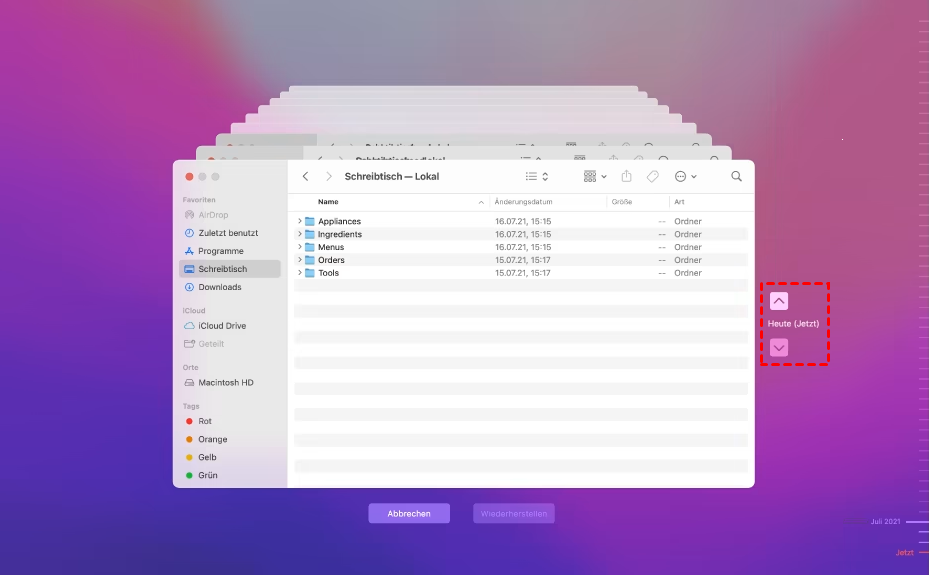 Wenn Sie zuvor Backups mit Time Machine erstellt haben, können Sie Ihre verlorenen Dateien von der externen Festplatte schnell und sicher wiederherstellen. Time Machine legt automatische Sicherungen an, wie stündlich, täglich und wöchentlich, sodass Sie ältere Dateiversionen leicht wiederfinden können.