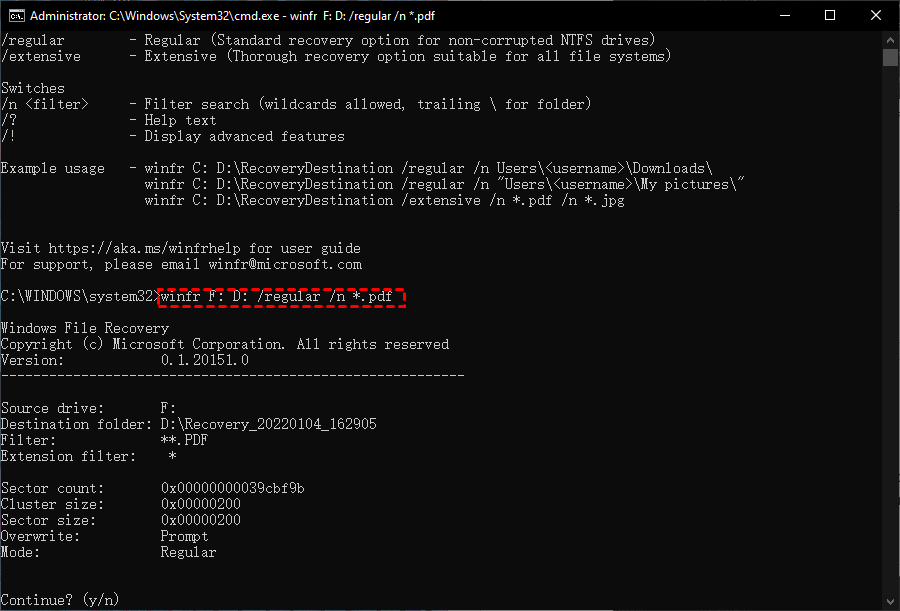 Wenn Sie zum Beispiel gelöschte PDF-Dateien von Laufwerk F: (der externen Festplatte) auf Laufwerk D: wiederherstellen möchten, lautet der Befehl wie folgt: