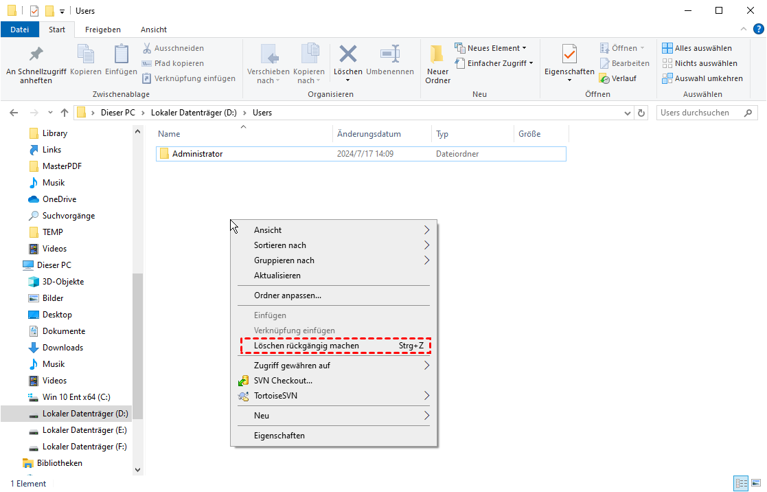 Windows verfügt auch über eine Funktion „Löschen rückgängig machen“, mit der Sie Ihre letzte Aktion rückgängig machen können. Wenn Sie beispielsweise zuletzt eine Datei gelöscht haben, können Sie die gelöschte Datei direkt wiederherstellen. Mit dieser Methode sparen Sie mehr Zeit als mit der Wiederherstellung aus dem Papierkorb.