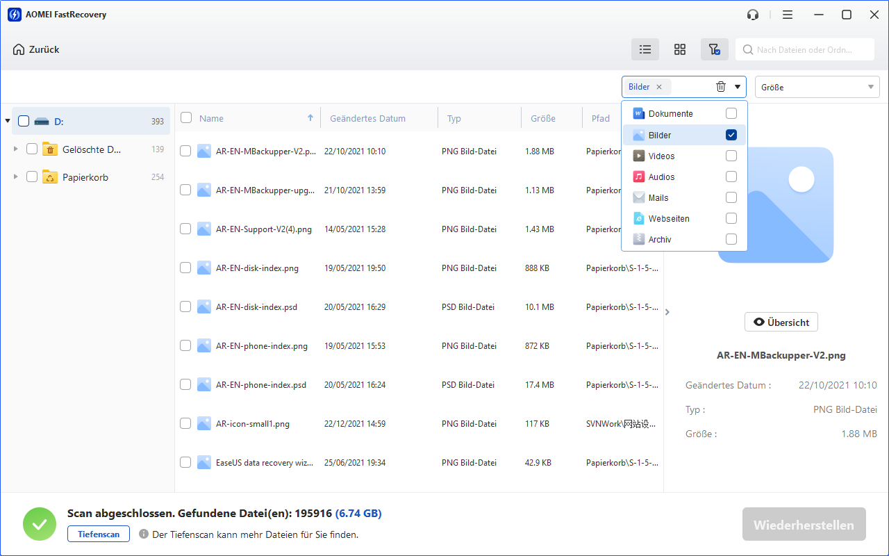 Methode 1. Dauerhaft gelöschte Daten wiederherstellen mit AOMEI FastRecovery