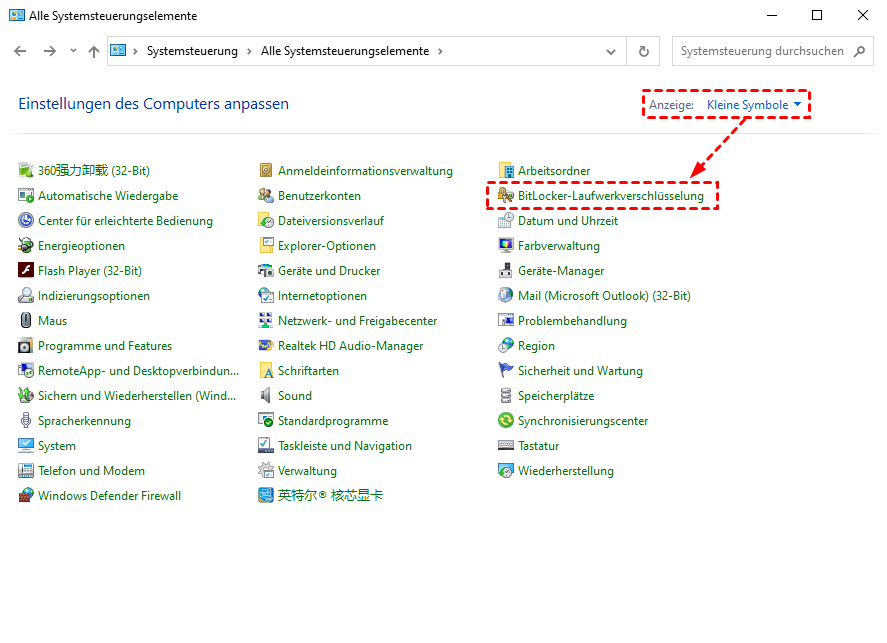 Schritt 1. Gehen Sie zu „Systemsteuerung“ und wählen Sie „BitLocker-Laufwerkverschlüsselung“.