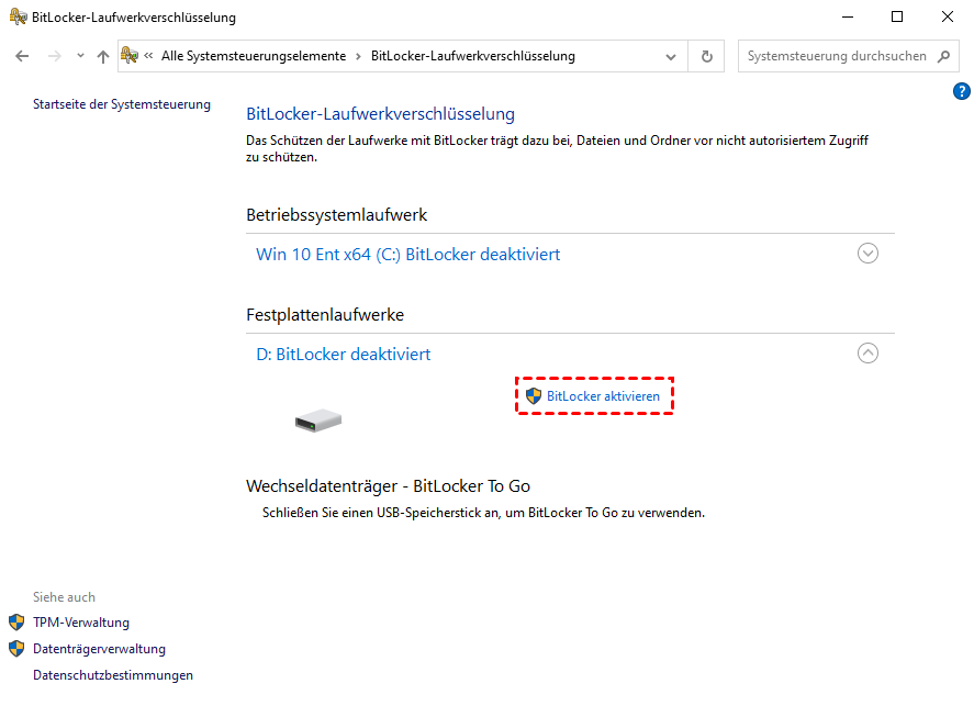 Wenn Sie die Bitlocker-Verschlüsselung auf einem USB-Stick, einer externen Festplatte oder einer SD-Karte aktivieren, erlaubt Microsoft Ihnen nicht, Daten zu schreiben oder Dateien auf Ihre Geräte zu kopieren. Sie können wählen, die Bitlocker-Verschlüsselung zu deaktivieren und überprüfen, ob Sie immer noch die Fehlermeldung „Der Datenträger ist schreibgeschützt“ erhalten.