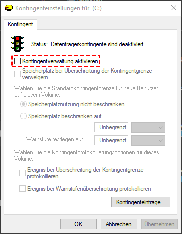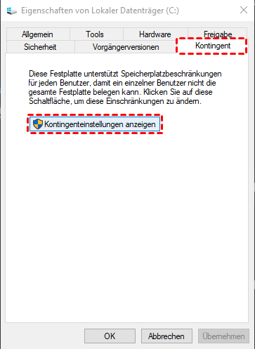 Methode 4: Festplattenkontingent-Einstellungen deaktivieren