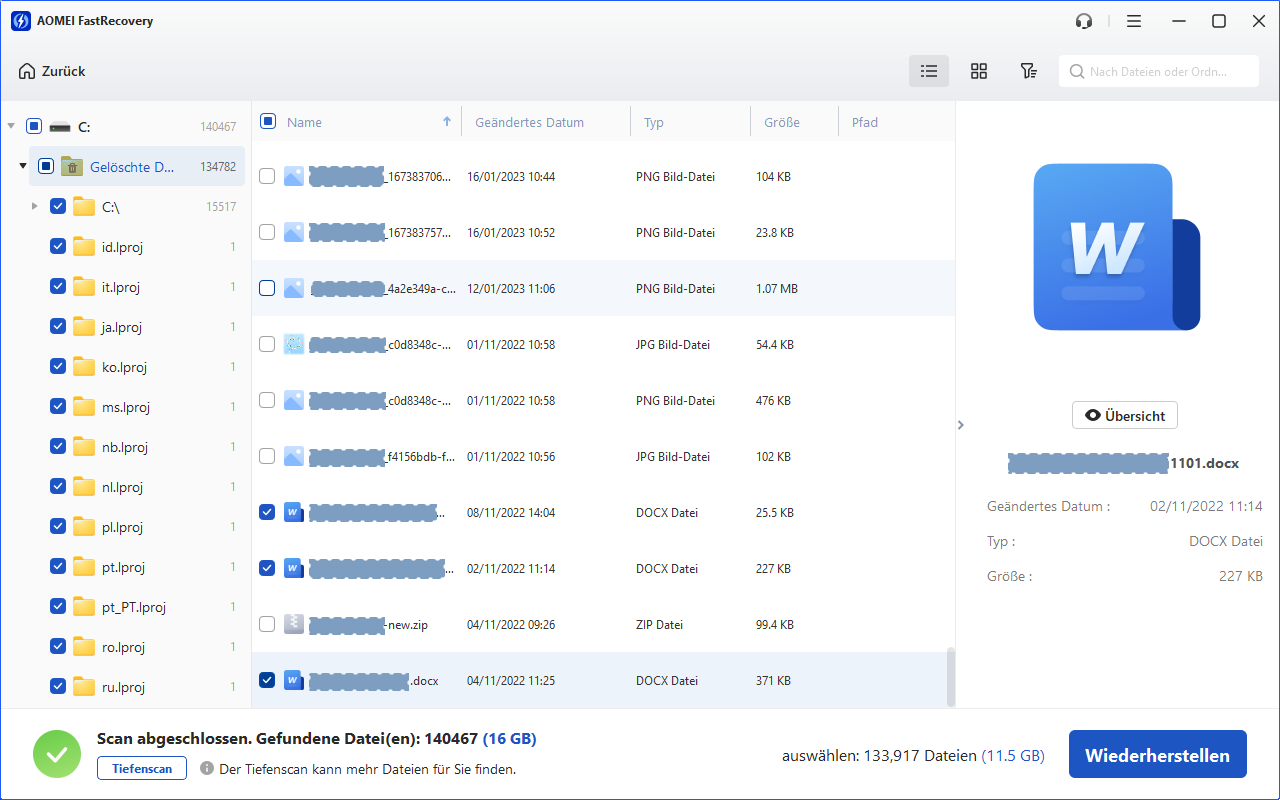 - Einfach und bequem: Stellt gelöschte/verlorene Dateien wieder her und behält Dateinamen, Pfade und Strukturen bei.