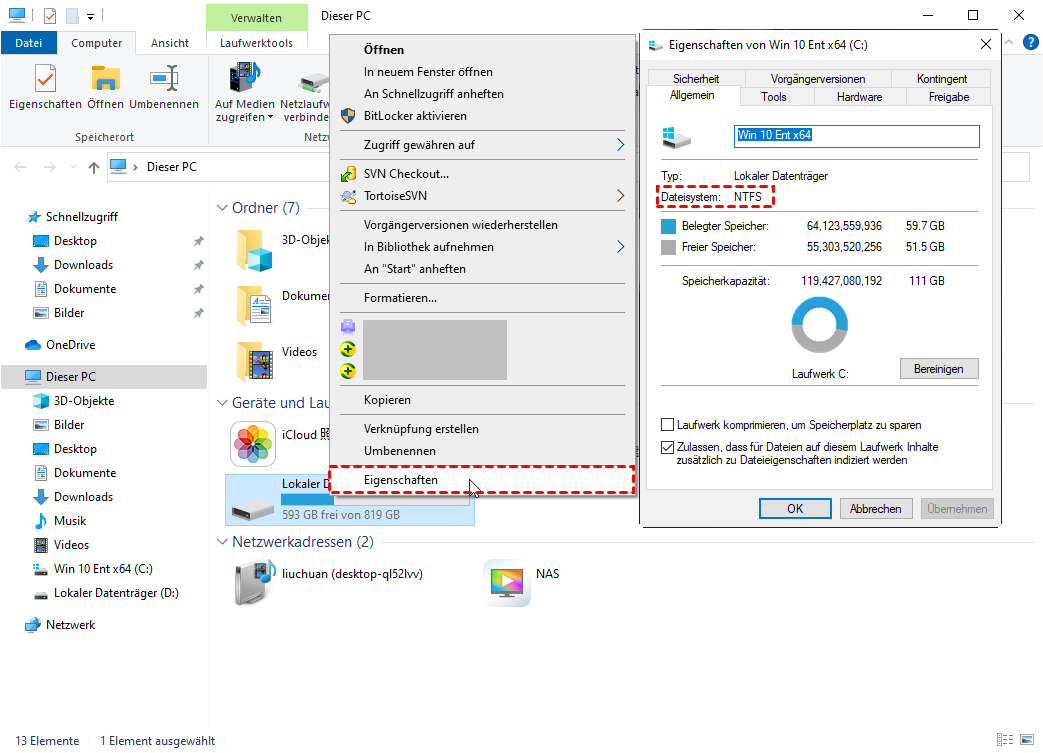 Um dieses Dienstprogramm zu verwenden, müssen Sie zuerst Ihr Dateisystem überprüfen. Drücken Sie „Win+E“, um „Dieser PC“ zu öffnen. Klicken Sie mit der rechten Maustaste auf das Laufwerk, von dem Sie Dateien gelöscht haben, klicken Sie auf „Eigenschaften“.