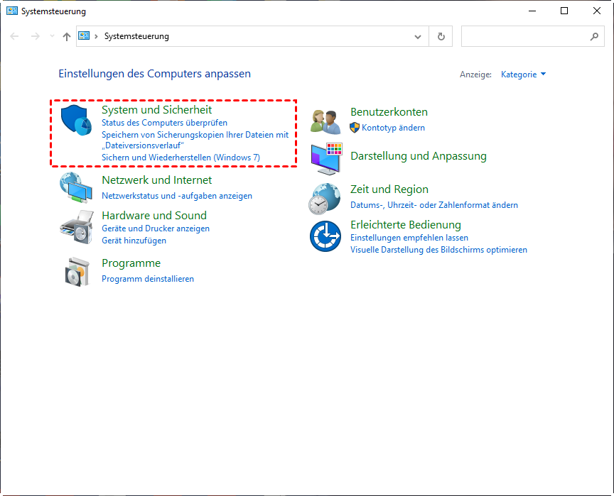 Schritt 1. Starten Sie die „Systemsteuerung“ auf Ihrem PC und klicken Sie dann auf „System und Sicherheit“.