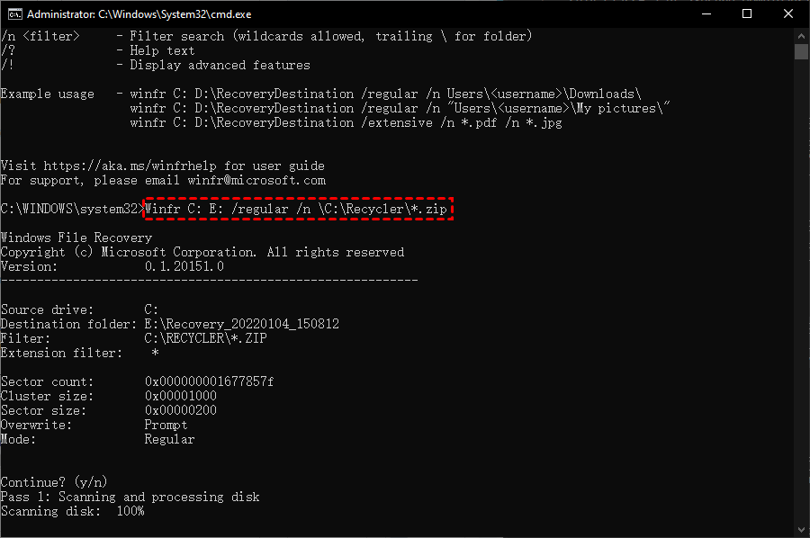 winfr C: E: /extensiv /n \C:\Recycler\*.zip