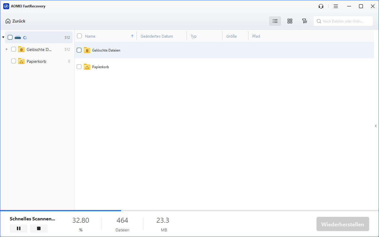 Schritt 3. Gehen Sie zum Ordner „Papierkorb“, wählen Sie die benötigten Dateien aus. Klicken Sie auf „Wiederherstellen“, um sie wiederherzustellen. Sie brauchen nicht zu warten, bis der Scanvorgang abgeschlossen ist.