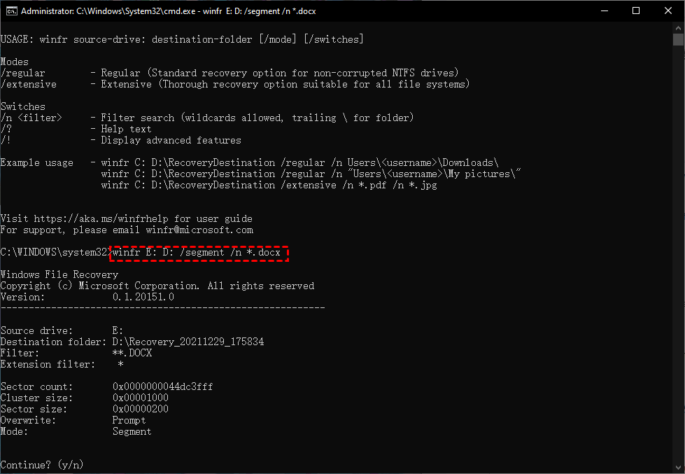 Schritt 2. Wählen Sie den Standardmodus aus und geben Sie „winfr source-drive:destination-drive: [/mode] [/switches]“ ein und drücken Sie dann „Enter“.