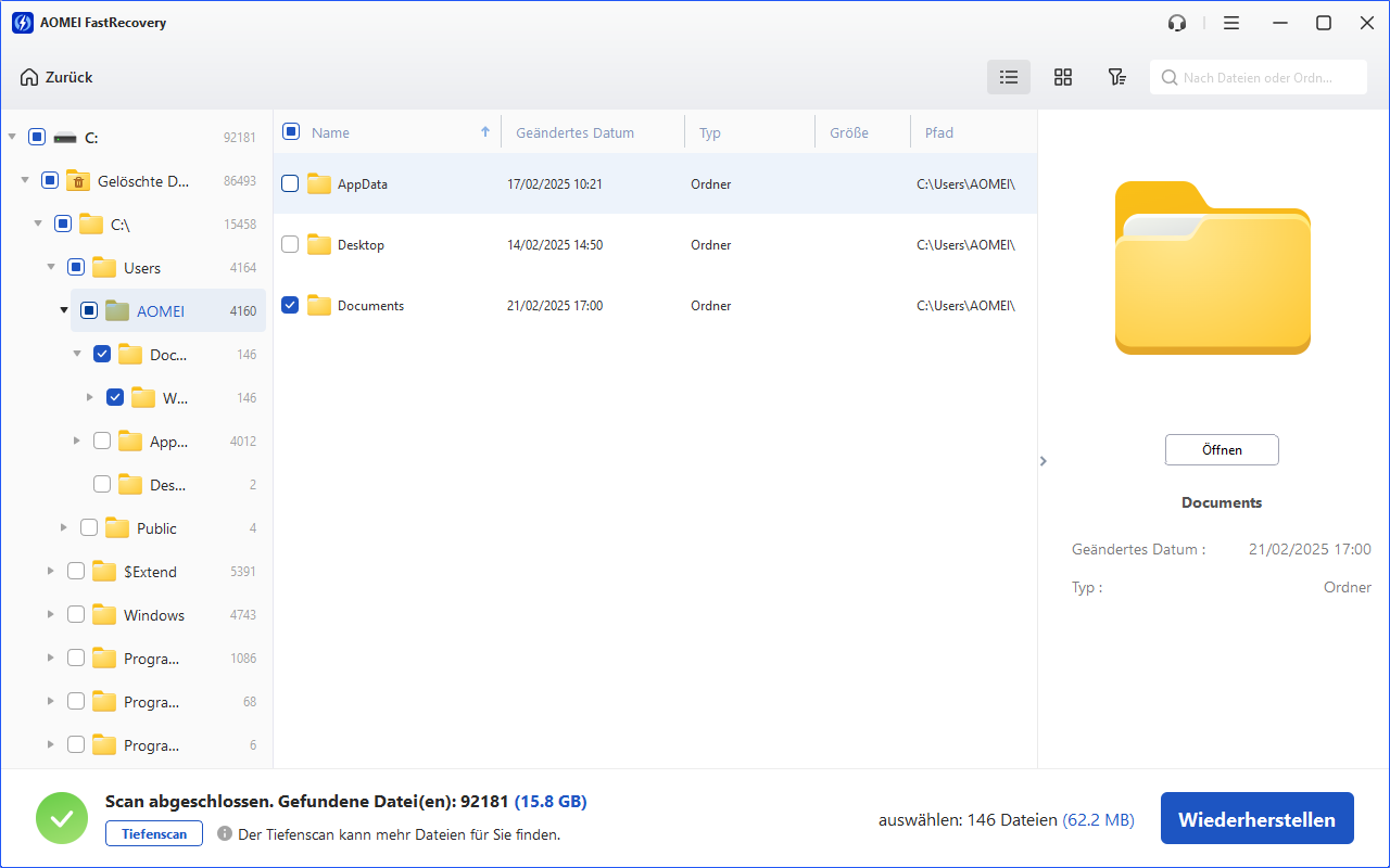 Programme wie AOMEI FastRecovery ermöglichen eine einfache Wiederherstellung gelöschter Dateien mit wenigen Klicks.
