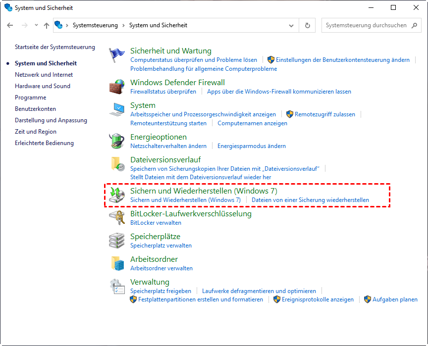 Schritt 1. Gehen Sie zu Systemsteuerung und drücken Sie die Eingabetaste. Klicken Sie unter System und Sicherheit auf Sichern und Wiederherstellen (Windows 7).