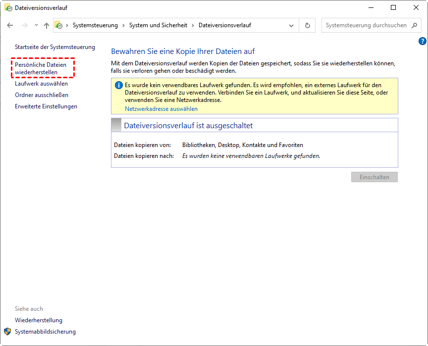 Der Dateiversionsverlauf speichert Kopien von Dateien auf dem Laufwerk c:, z. B. Desktop, Dokumente, Favoriten usw. Wenn die gelöschten Dateien vom Laufwerk c: stammen, ist diese Methode für Sie geeignet.