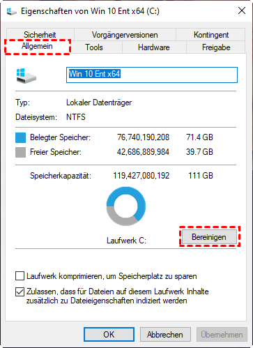 2. Klicken Sie auf der Registerkarte „Allgemein“ auf „Datenträgerbereinigung“.