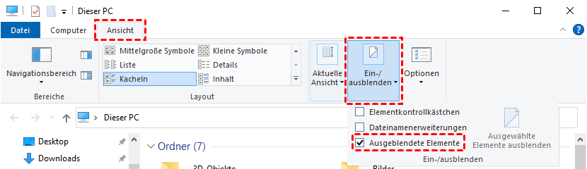 Der temporäre Ordner Temp wird von Windows standardmäßig ausgeblendet. Um diesen Ordner zu sehen, müssen Sie oben im Fenster auf die Registerkarte „Ansicht“ klicken und das Kontrollkästchen „Ausgeblendete Elemente“ aktivieren.