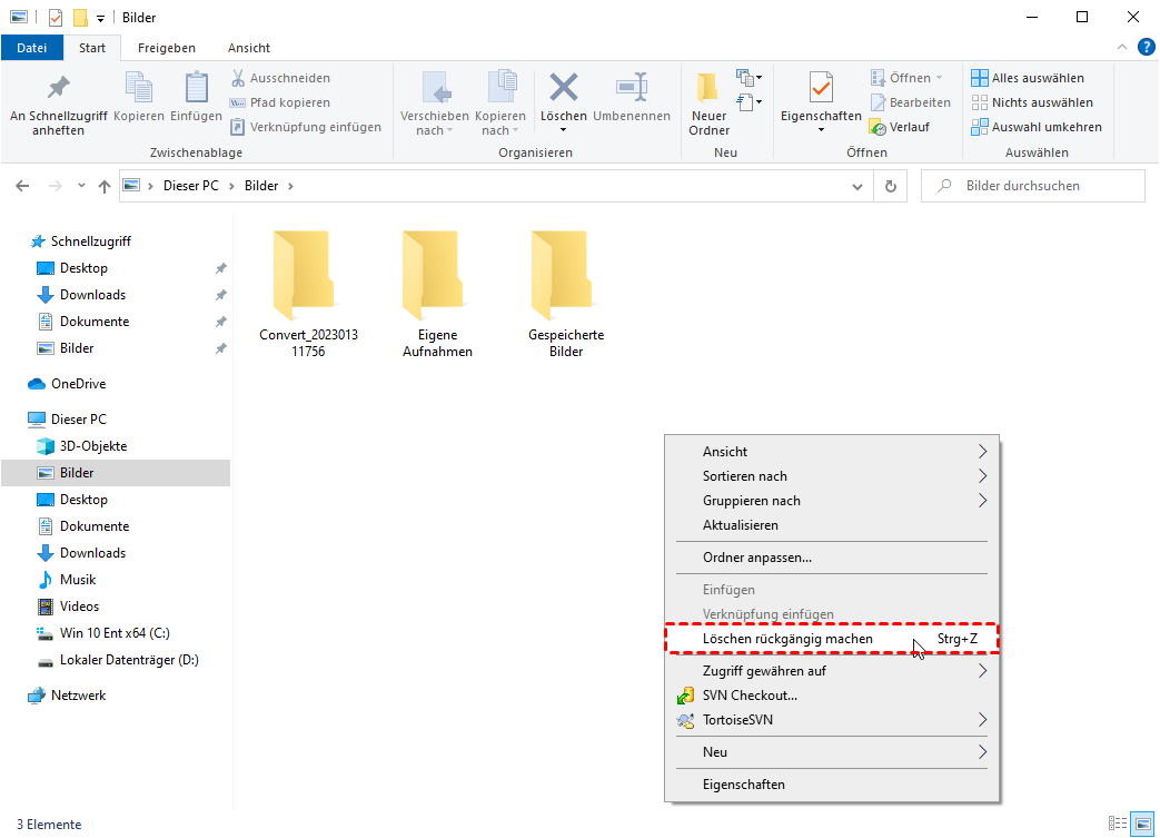 Öffnen Sie den Ordner, in dem die gelöschte Datei war. Drücken Sie Strg + Z, oder rechtsklicken Sie im Ordner und wählen Sie Löschen rückgängig machen.