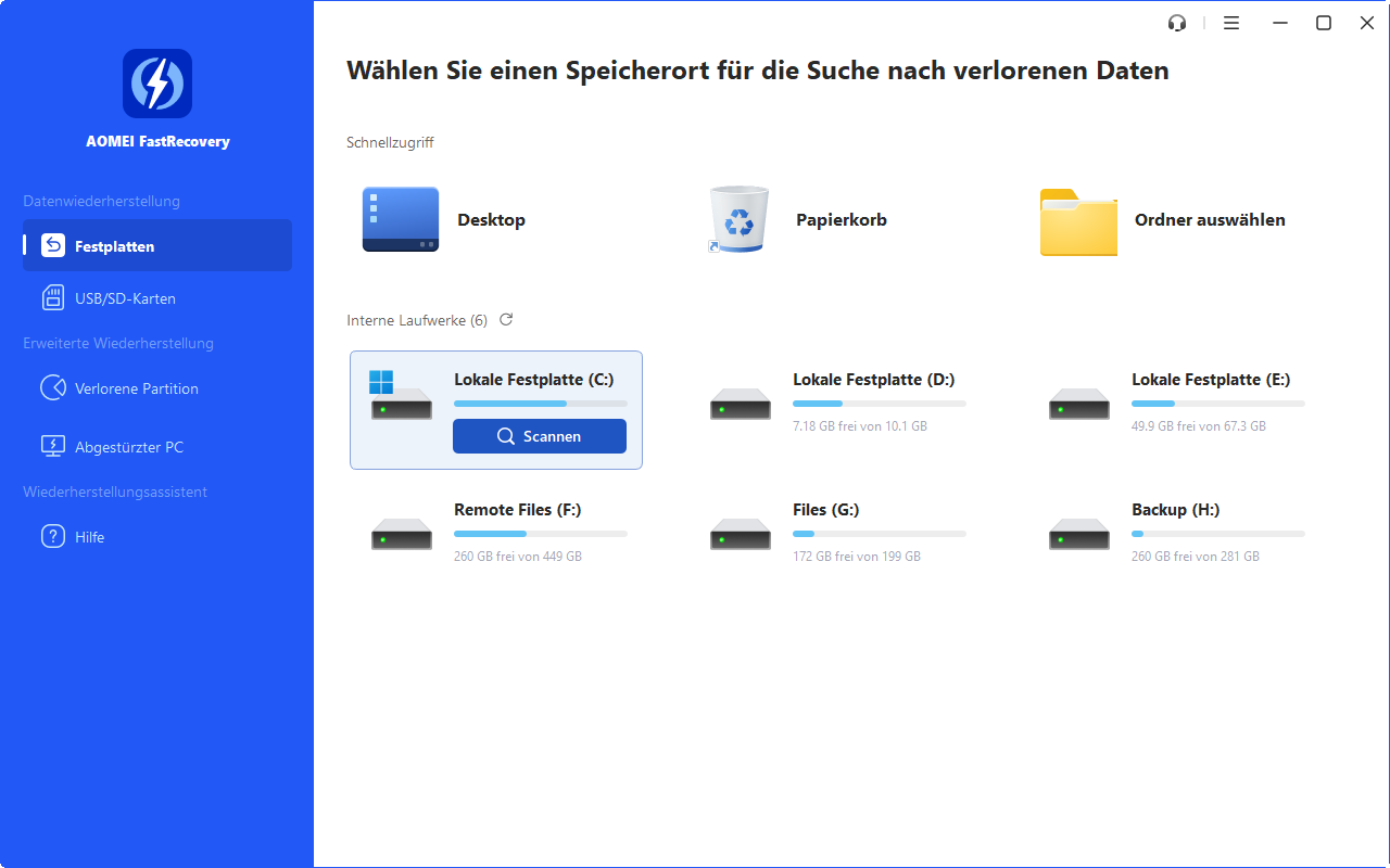 Schritt 1. Führen Sie AOMEI FastRecovery aus. Bewegen Sie die Maus über das Laufwerk, auf dem die gelöschten Dateien gespeichert wurden, und klicken Sie auf Scannen.