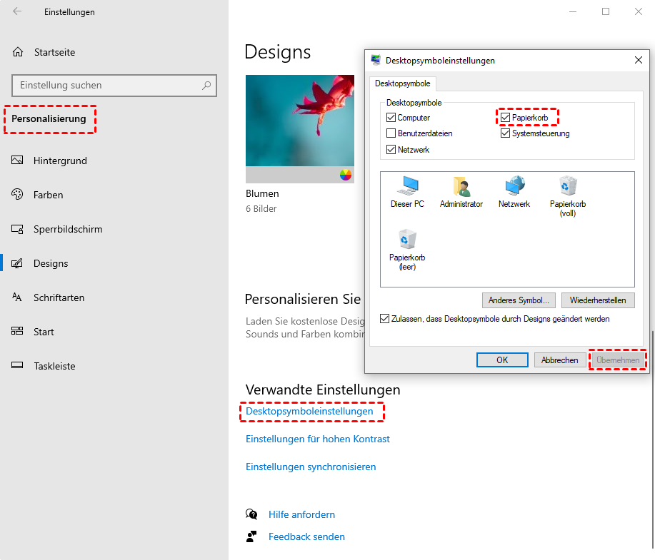 - Aktivieren Sie das Kontrollkästchen „Papierkorb“ und bestätigen Sie mit „Übernehmen“.