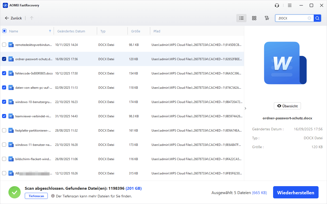 Schritt 3. Nach Abschluss des Scanvorgangs werden alle fehlenden Dateien angezeigt. Wählen Sie bitte die gewünschten Dateien aus und klicken Sie dann auf Wiederherstellen.