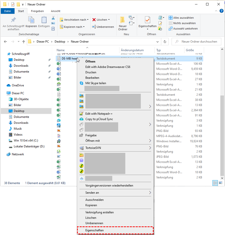 Schritt 2. Suchen Sie den Ordner, der Ihre gewünschten Excel-Dateien enthält, bevor Sie sie überschreiben. Klicken Sie dann mit der rechten Maustaste darauf und wählen Sie „Eigenschaften“.