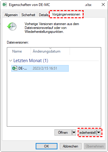 Schritt 3. Wählen Sie im Reiter „Vorgängerversionen“ eine passende Excel-Dateiversion nach Datum und Relevanz aus. Klicken Sie anschließend auf „Wiederherstellen“ und speichern Sie die Datei an Ihrem gewünschten Speicherort.
