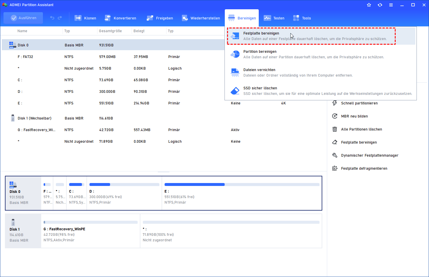 Die sicherste, benutzerfreundlichste und vielseitigste Methode zur Datenvernichtung ist die Verwendung einer professionellen Software. AOMEI Partitionssoftware ist ein leistungsstarkes Tool, das speziell für die sichere Festplattenlöschung entwickelt wurde und mehrere Überschreibverfahren nach internationalen Standards bietet. Anders als einfache Löschbefehle des Betriebssystems macht diese Methode eine spätere Wiederherstellung der Daten praktisch unmöglich.