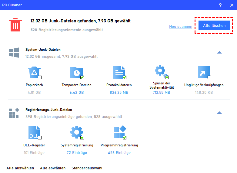 Schritt 3: Warten Sie einige Minuten, bis die Fortschrittsleiste voll ist. Wählen Sie die Ziel-Junk-Dateien aus und klicken Sie auf Alle löschen.