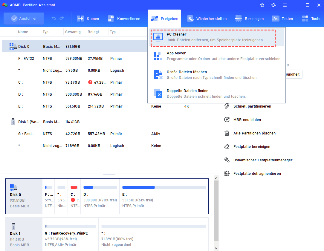 Manuell ist die Bereinigung all dieser Cache-Arten aufwendig und fehleranfällig. Hier kommt ein kostenloses Tool ins Spiel: AOMEI Partitionssoftware ist ein vielseitiges Programm, das weit mehr kann als nur Partitionen verwalten. Mit seinen integrierten Bereinigungswerkzeugen hilft er Ihnen, Ihren Computer von überflüssigen Dateien zu befreien und die Leistung zu optimieren.