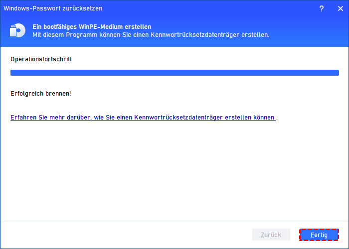 Schritt 5. Warten Sie eine Weile, es wird einige Minuten dauern, bis der USB-Stick zum Zurücksetzen des Passworts erstellt ist, und klicken Sie dann auf Fertig.