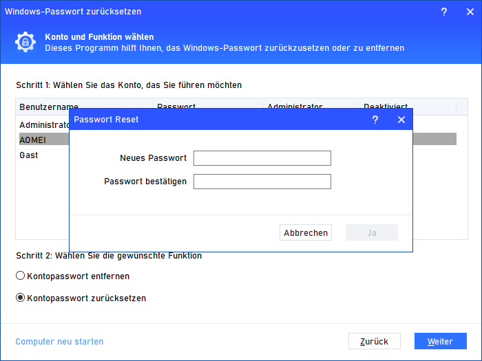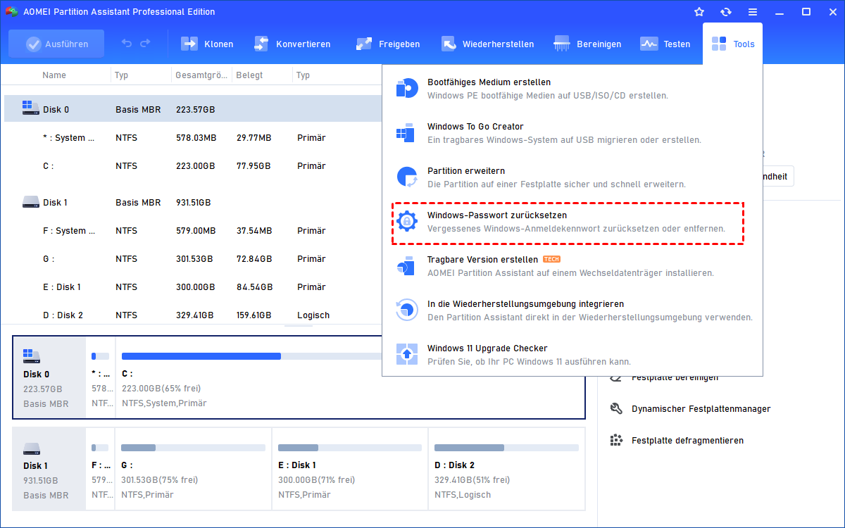 Methode 6. PC Kennwort ändern mit Profi-Tool (AOMEI Partitionssoftware)