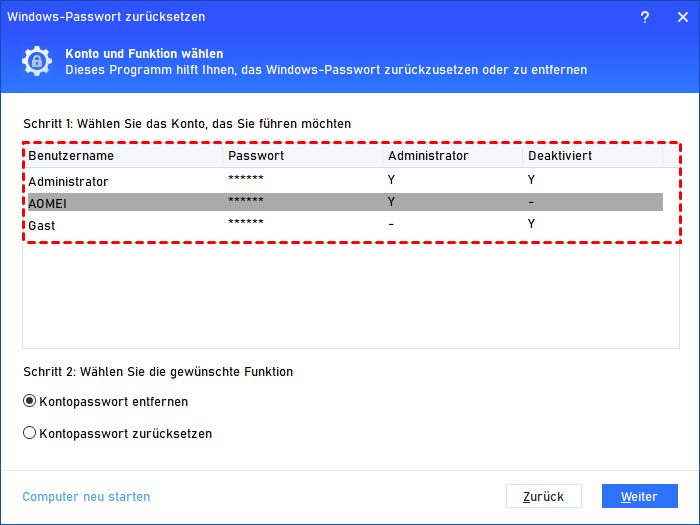 Schritt 7. Alle Konten auf Ihrem PC werden angezeigt. Wählen Sie eines aus und markieren Sie Kontopasswort entfernen oder Kontopasswort zurücksetzen, dann klicken Sie auf Weiter.