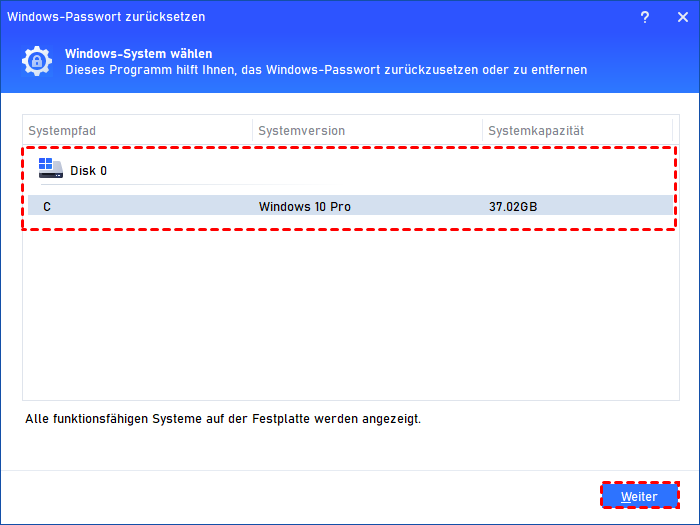 Schritt 6. Nehmen Sie den USB-Stick des aktuellen PCs heraus, stecken Sie ihn in den gesperrten Laptop und starten Sie ihn neu. Sie sollen das Boot-Laufwerk ändern und den PC von dem erstellten USB booten, wählen dann das Betriebssystem und klicken auf Weiter.