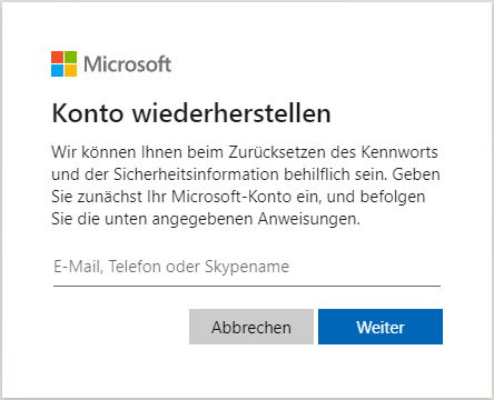 Schritt 1. Öffnen Sie das Fenster von „Microsoft Konto wiederherstellen“, geben Sie die E-Mail oder die Telefonnummer, dann klicken Sie auf Weiter.
