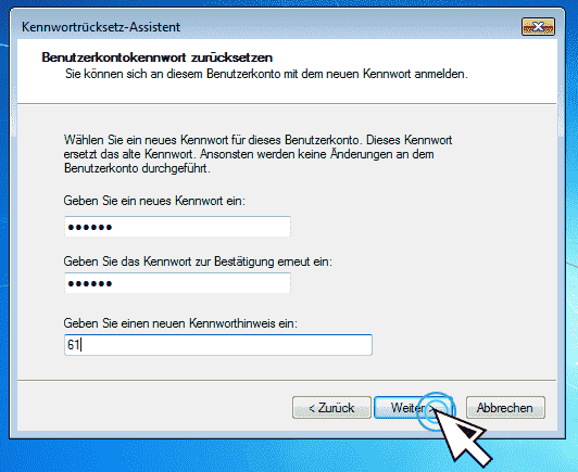 Schritt 3. Nach erfolgreicher Beantwortung können Sie ein neues Passwort für Ihren PC festlegen. Geben Sie das neue Passwort zweimal ein und bestätigen Sie mit „Weiter“.