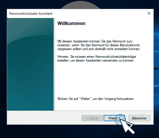 Wenn Sie vorausschauend gehandelt und einen Kennwortrücksetzdatenträger (USB-Stick) erstellt haben, können Sie damit Ihr PC Passwort ändern, ohne Ihr altes Passwort zu kennen.
