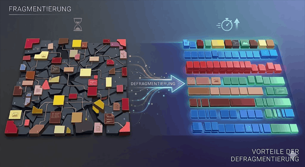 Die Defragmentierung ordnet diese verstreuten Dateien wieder neu an und legt sie zusammenhängend ab. Dadurch wird die Zugriffszeit verkürzt – Ihr PC wird spürbar schneller.