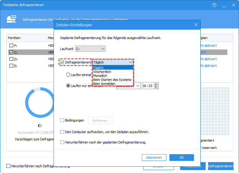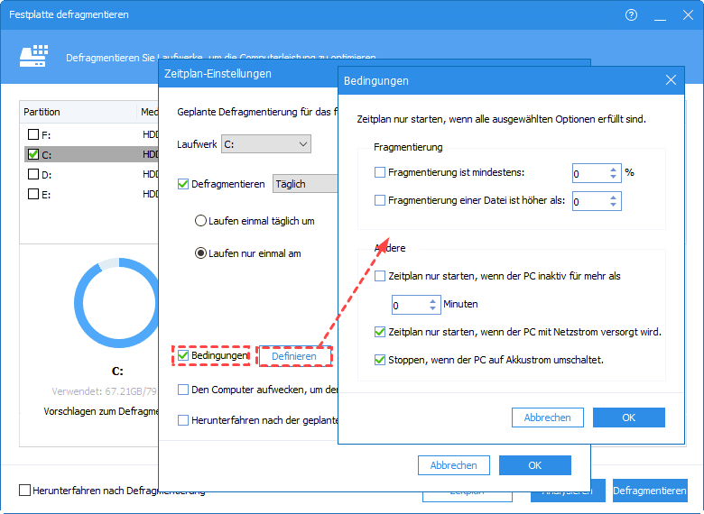 Schritt 4. Klicken Sie auf „Bedingungen“, um erweiterte Einstellungen vorzunehmen. Legen Sie fest, ab welcher Fragmentierungsrate die Defragmentierung starten soll (z. B. ab 10 %).